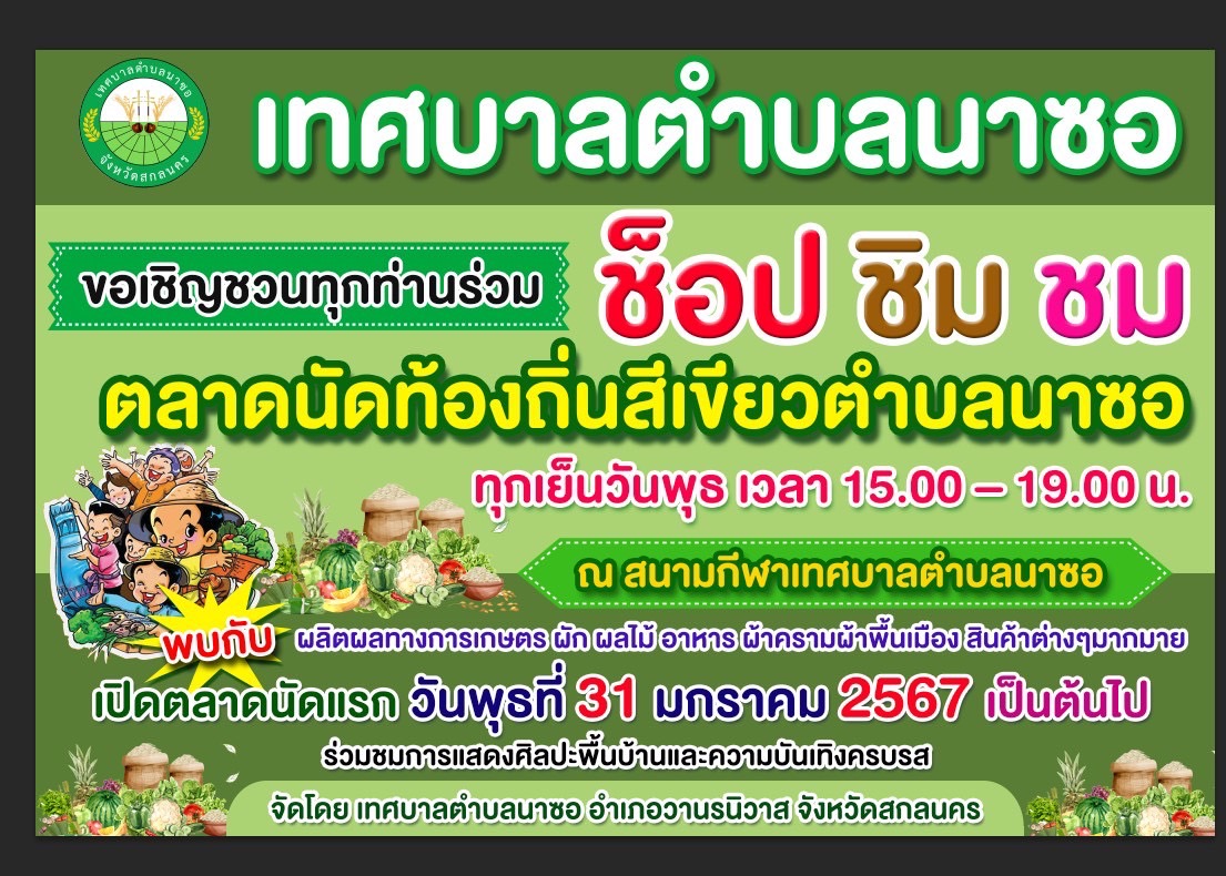 รายละเอียด : เทศบาลตำบลนาซอ นำโดยนายจารุบุตร อุปพงศ์ นายกเทศมนตรีตำบนาซอ พร้อมด้วยคณะกรรมการบริหาร งานสวัสดิการสังคม สำนักปลัด ร่วมเปิด "ตลาดนัดท้องถิ่นสีเขียว" ในวันที่ 31 มกราคม 2567 ณ สนามกีฬาเทศบาลตำบลนาซอ เริ่มตั้งแต่เวลา 15.00 - 19.00 น. จึงขอเรียนเชิญทุกท่านร่วม ช็อป ชิม ชม ตามวัน เวลา และสถานที่ดังกล่าว