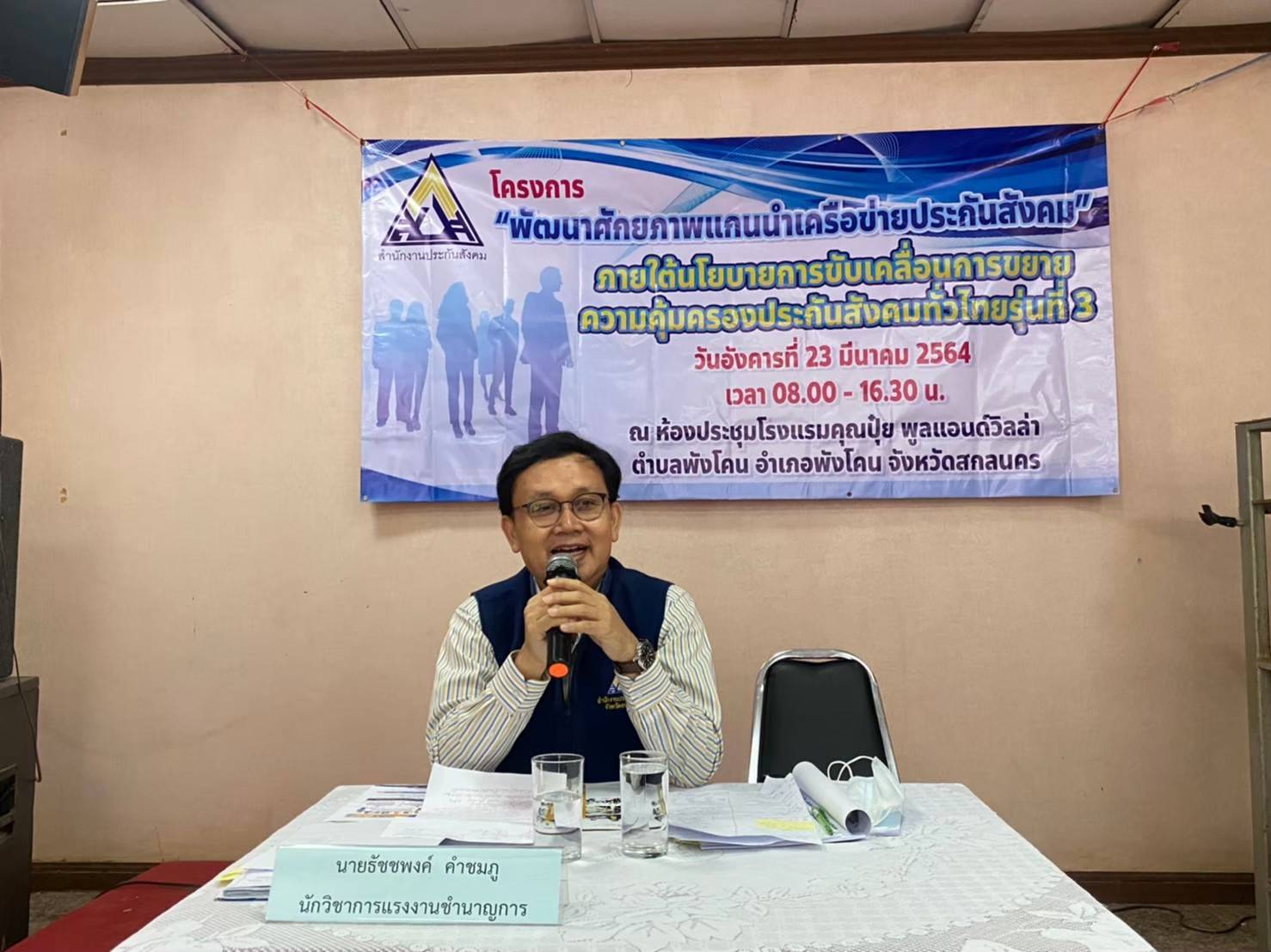 รายละเอียด : ในวันที่ 23 มีนาคม 2564 นายวิทมนตร์ เหล่าหว้าน รองปลัดเทศบาล รักษาราชการแทนปลัดเทศบาล ปฏิบัติหน้าที่นายกเทศมนตรีตำบลนาซอ มอบหมายให้นางสาวตวงพร จงโปร่งกลาง นักพัฒนาชุมชน และนายวิวัฒน์ อุปพงศ์ ผู้ช่วยเจ้าหน้าที่พัฒนาชุมชน เข้าร่วมโครงการพัฒนาศักยภาพแกนนำเครือข่ายประกันสังคม ณ ห้องประชุมโรงแรมคุณปุ๋ย พูลแอนด์วิลล่า ตำบลพังโคน อำเภอพังโคน จังหวัดสกลนคร
