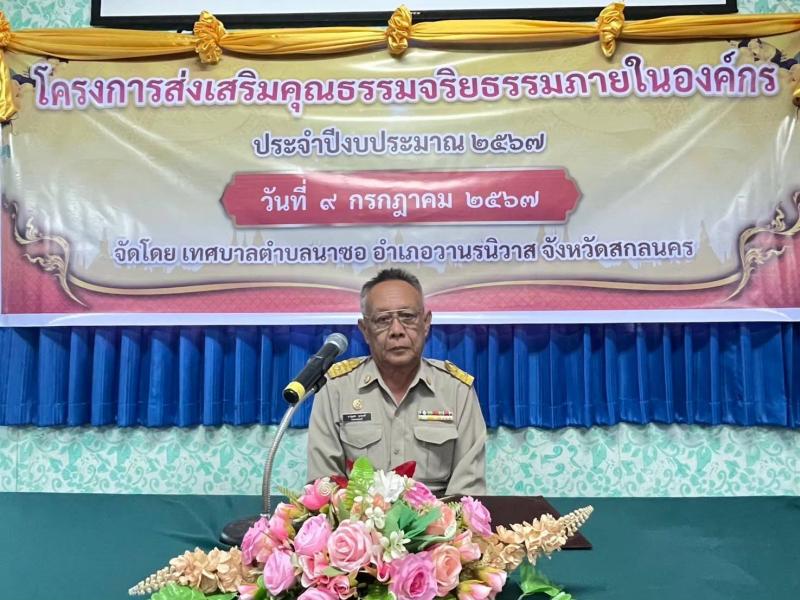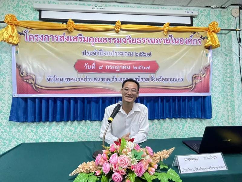 รายละเอียด : วันที่ ๙ กรกฎาคม พ.ศ.๒๕๖๗ นายจารุบุตร อุปพงศ์ นายกเทศมนตรีตำบลนาซอ ได้เป็นประธานในพิธีเปิดโครงการส่งเสริมคุณธรรมจริยธรรมภายในองค์กร ประจำปีงบประมาณ ๒๕๖๗ และได้รับความอนุเคราะห์วิทยากรจาก สำนักงาน ป.ป.ช.ประจำจังหวัดสกลนคร ราย นายสัญญา แก่นจำปา เจ้าพนักงานป้องกันการทุจริตชำนาญการ และนายเจษฎา พวงเงิน ปลัดเทศบาลตำบลอากาศอำนวย โดยมีกลุ่มเป้าหมาย คือ ผู้บริหาร พนักงานเทศบาล พนักงานจ้าง สังกัดเทศบาลตำบลนาซอ จำนวน ๖๖๕ คน ผลการฝึกอบรมเป็นไปด้วยความเรียบร้อย